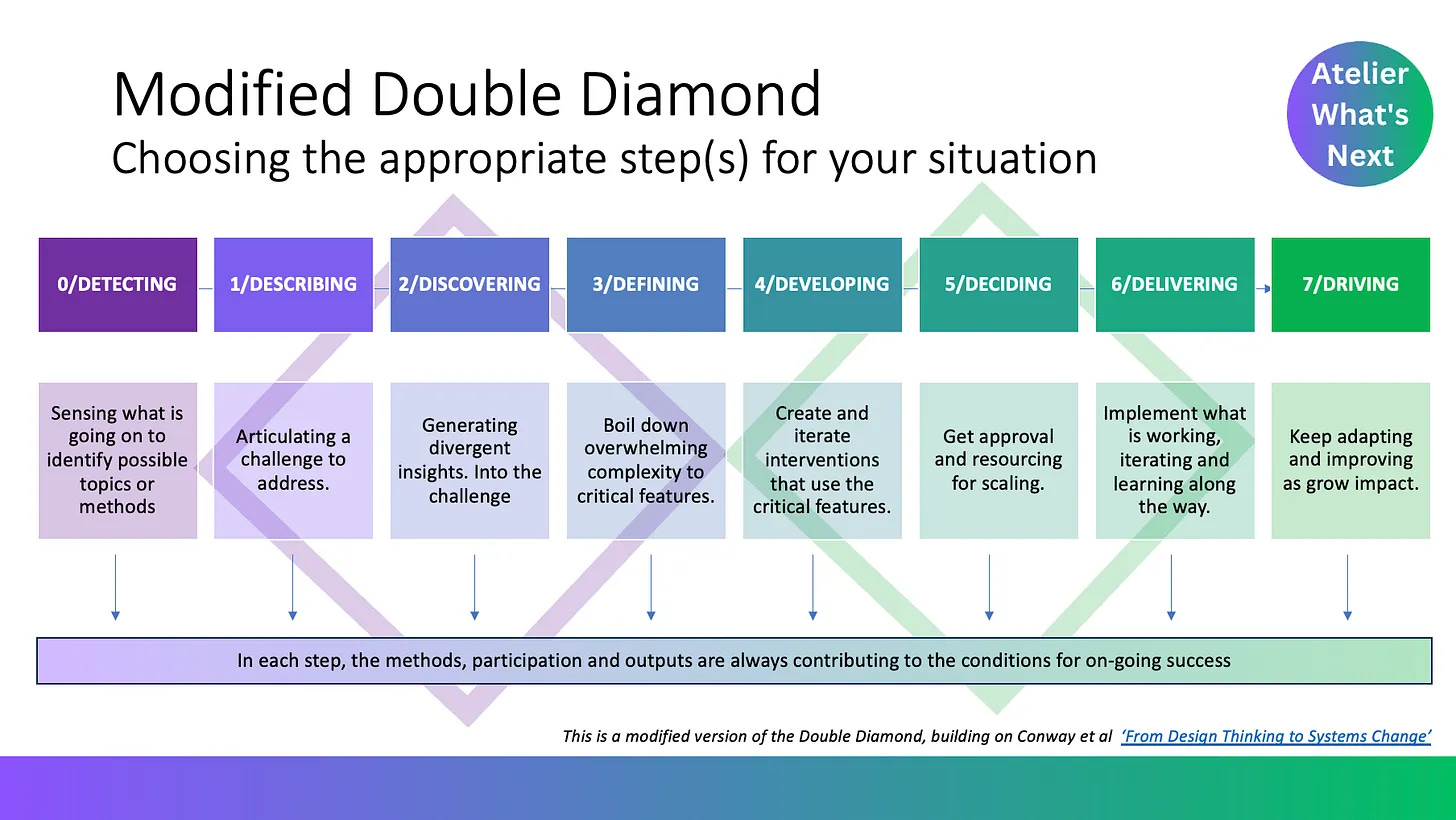 By the way, it is called “0/DETECTING” because it is the zeroth step in an attempted design process which draws on the Design Council’s Double Diamond via Rowan Conway. The “0” indicates it is the morass from which specifics emerge, in step 1/DESCRIBING: